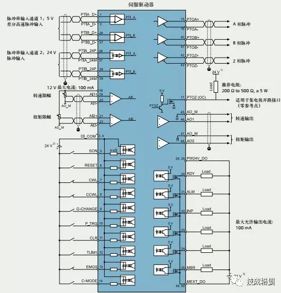 (1)用于SINAMICS V90的24V電源。所有的PTO信號(hào)都必須連接至使用同一24V電源的控制器,如SINAMICS V90。